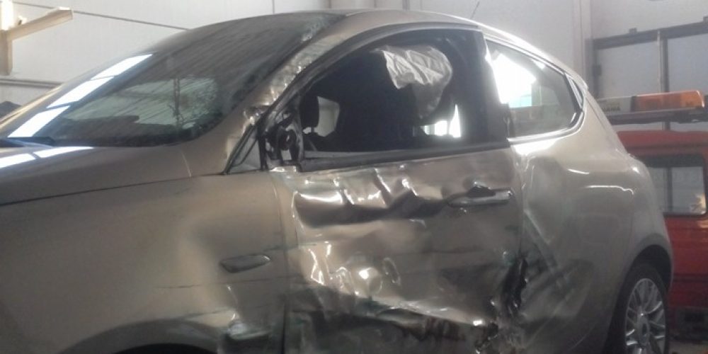 Riparazione della fiancata sinistra danneggiata a seguito di incidente: carrozzeria, cristalli, specchietto retrovisore. Ripristino airbag.