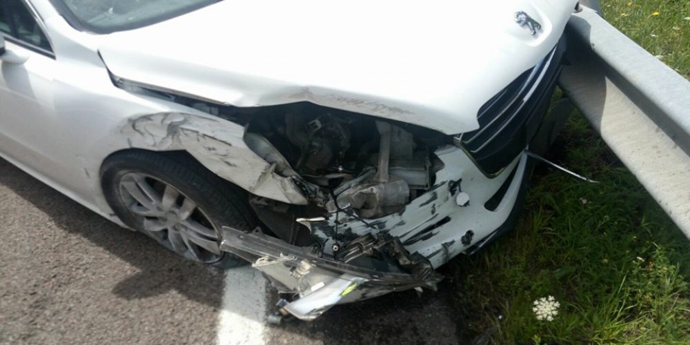 Intervento di soccorso stradale per Peugeot 308 coinvolta in un incidente con altri veicoli. Interventi meccanici e di carrozzeria per la riparazione della parte frontale danneggiata.